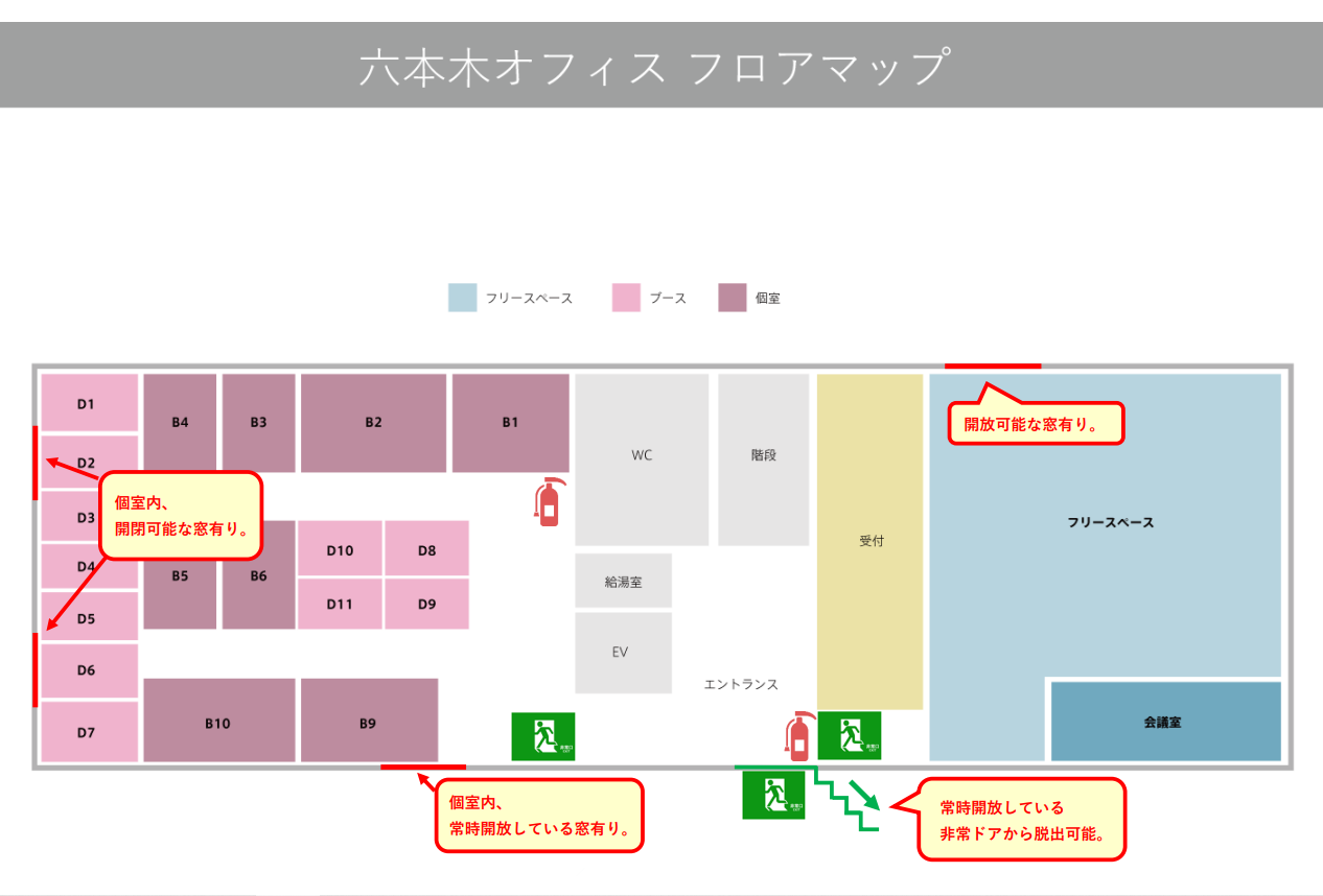 ・緊急時に備え、ビルの非常口やオフィスからの避難経路を再度ご確認下さい。