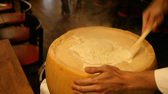 大きなパルミジャーノチーズ!!こちらが定員さんとともにウロウロしてます。