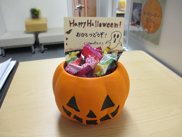 只今受付にハロウィンチョコを置いてます。お一つどうぞ!