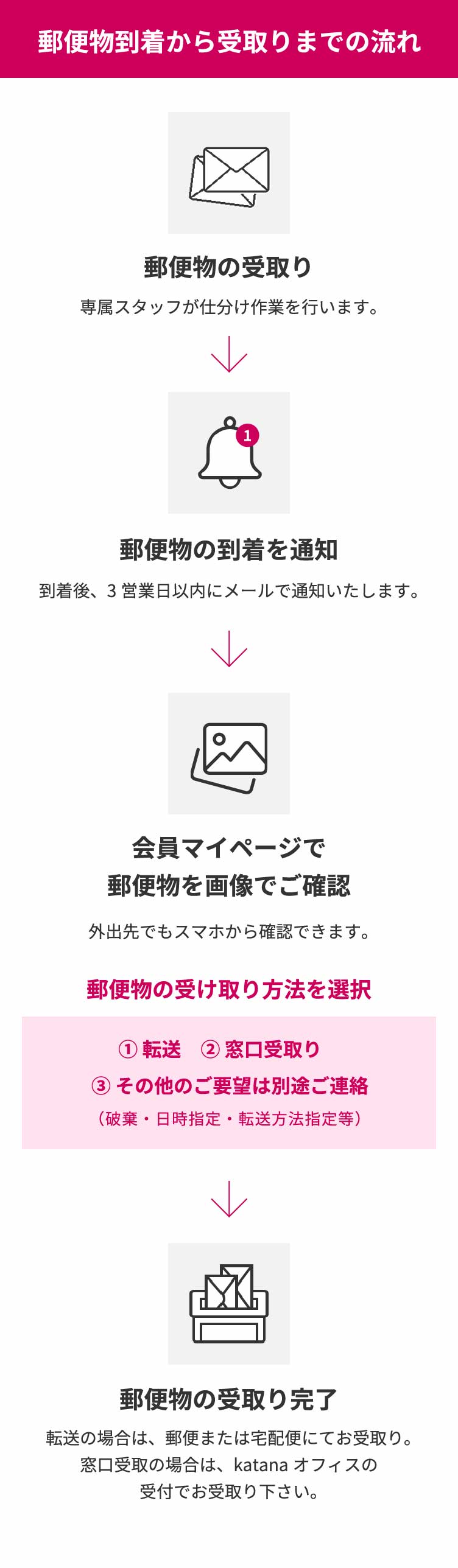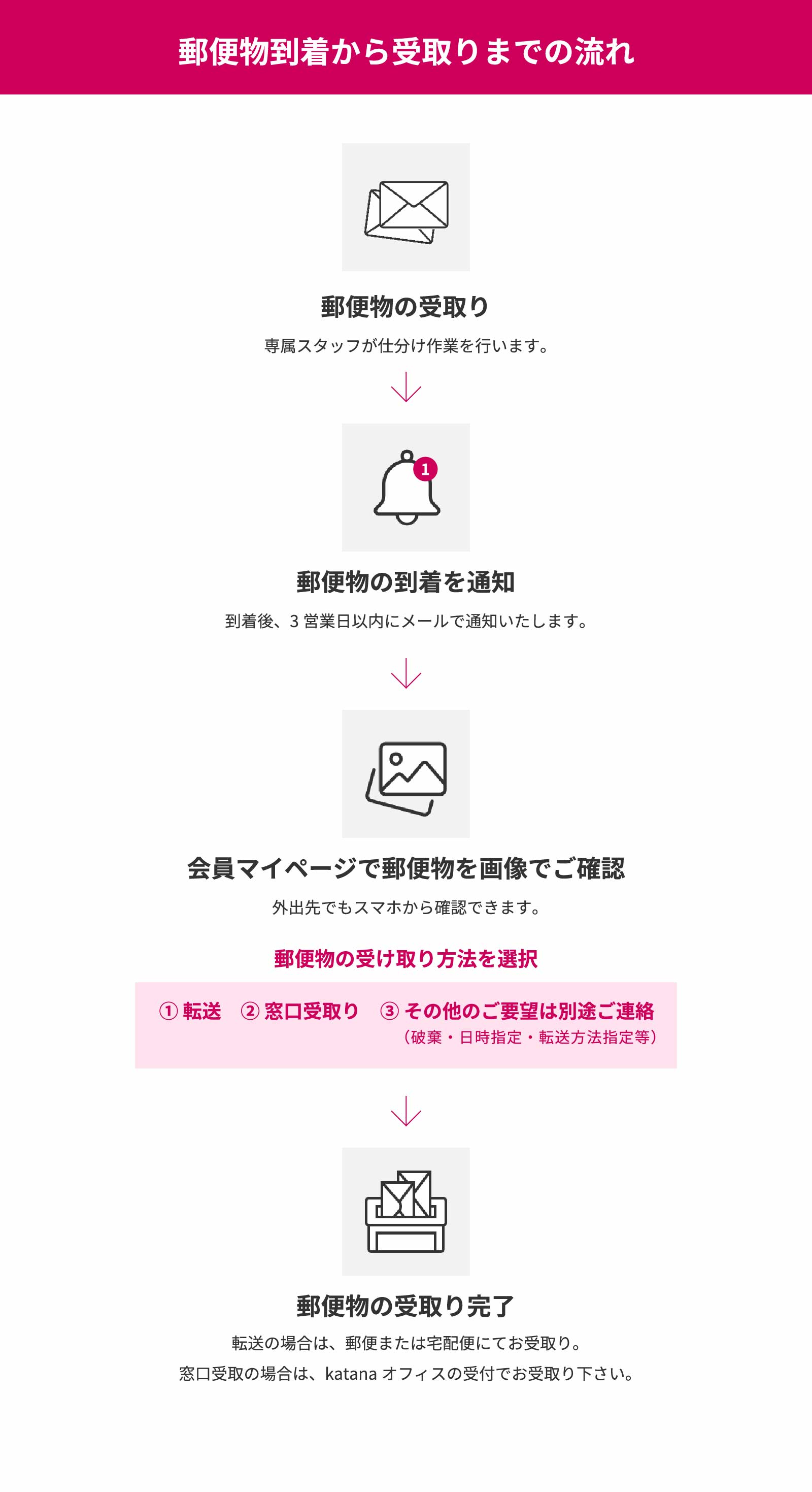 専属スタッフが郵便物の受け渡しやご案内、転送を対応させていただきます。出張中で郵便物や荷物が受け取れない場合は、代行して受け取りをいたします。届いた郵便物は、会員マイページから画像で確認が可能です。